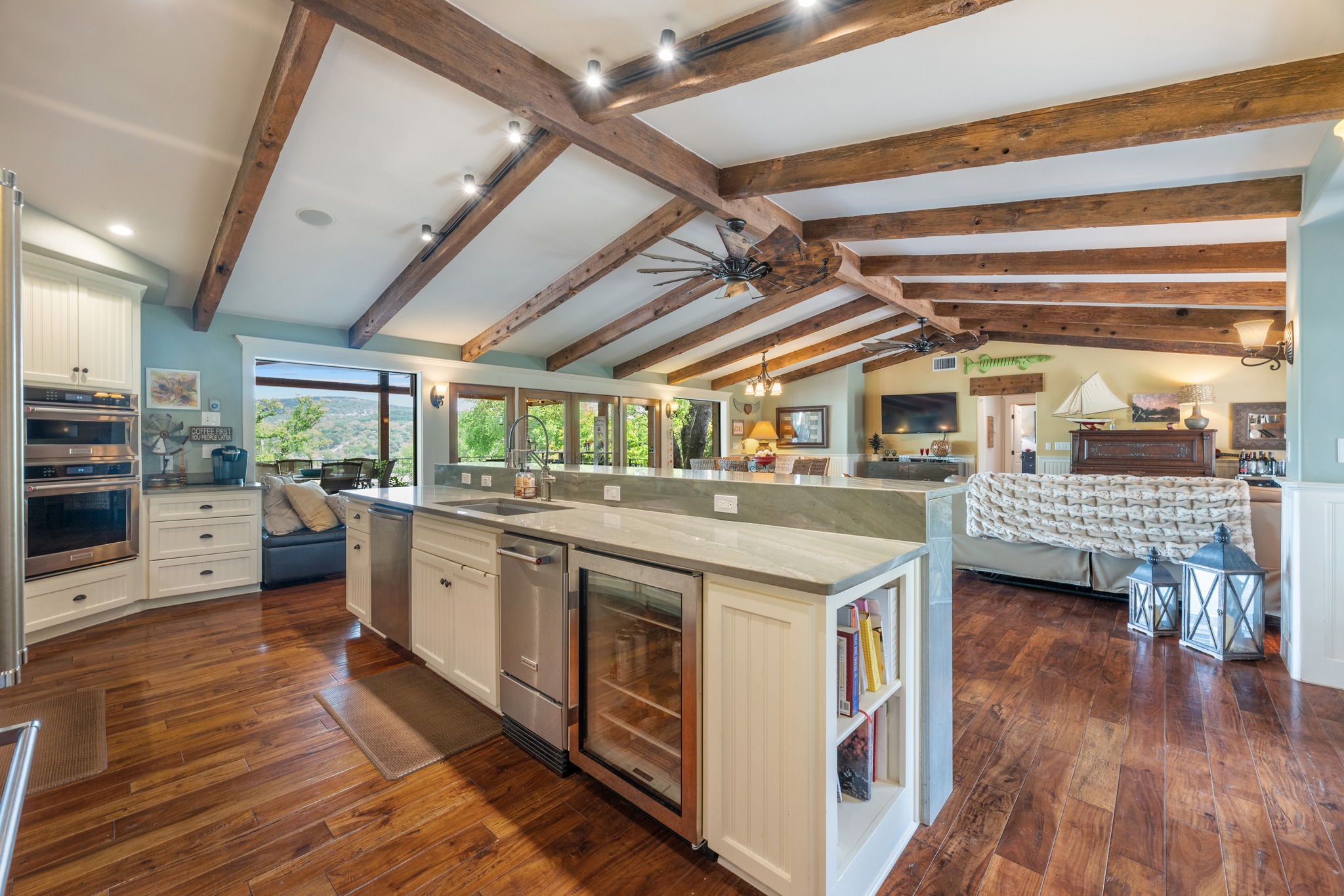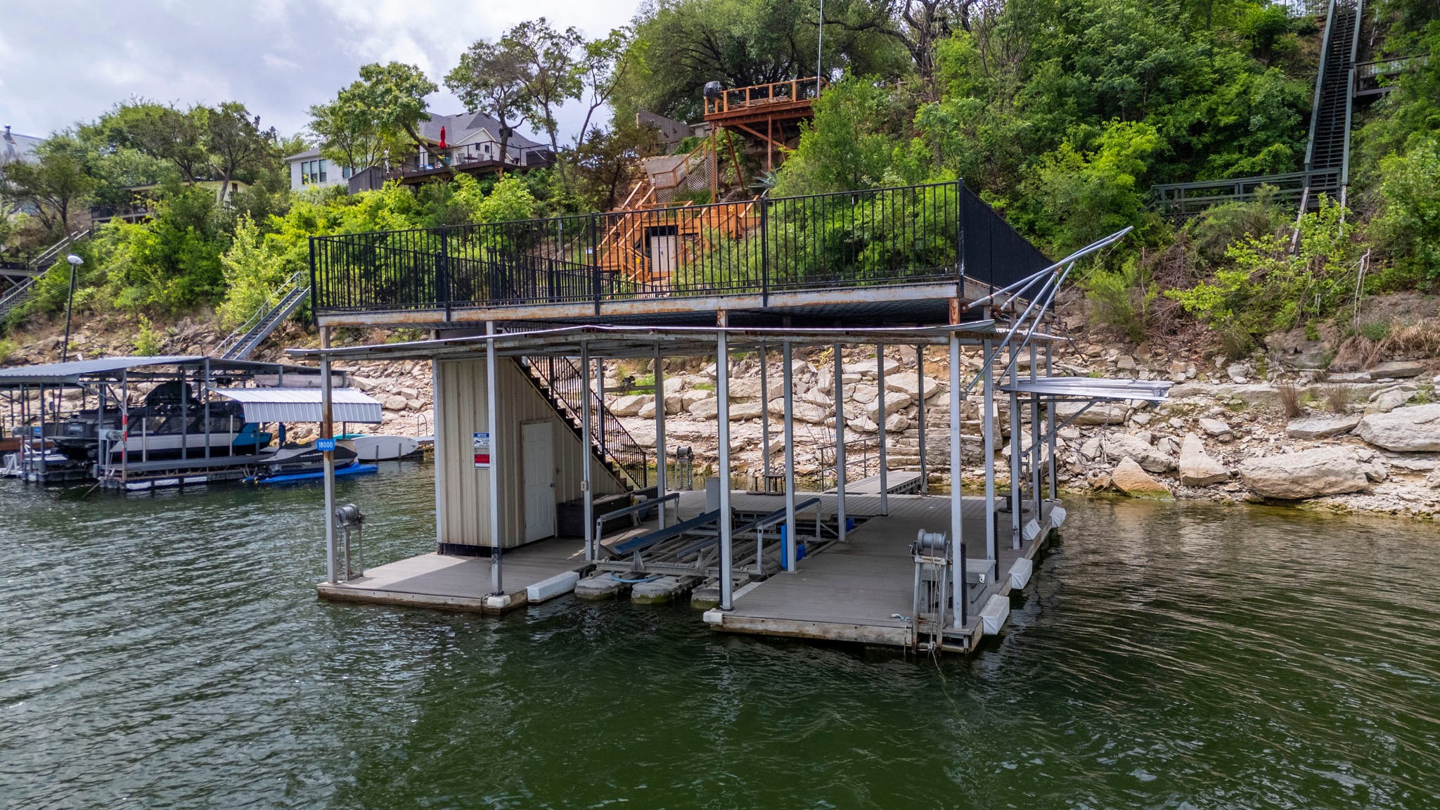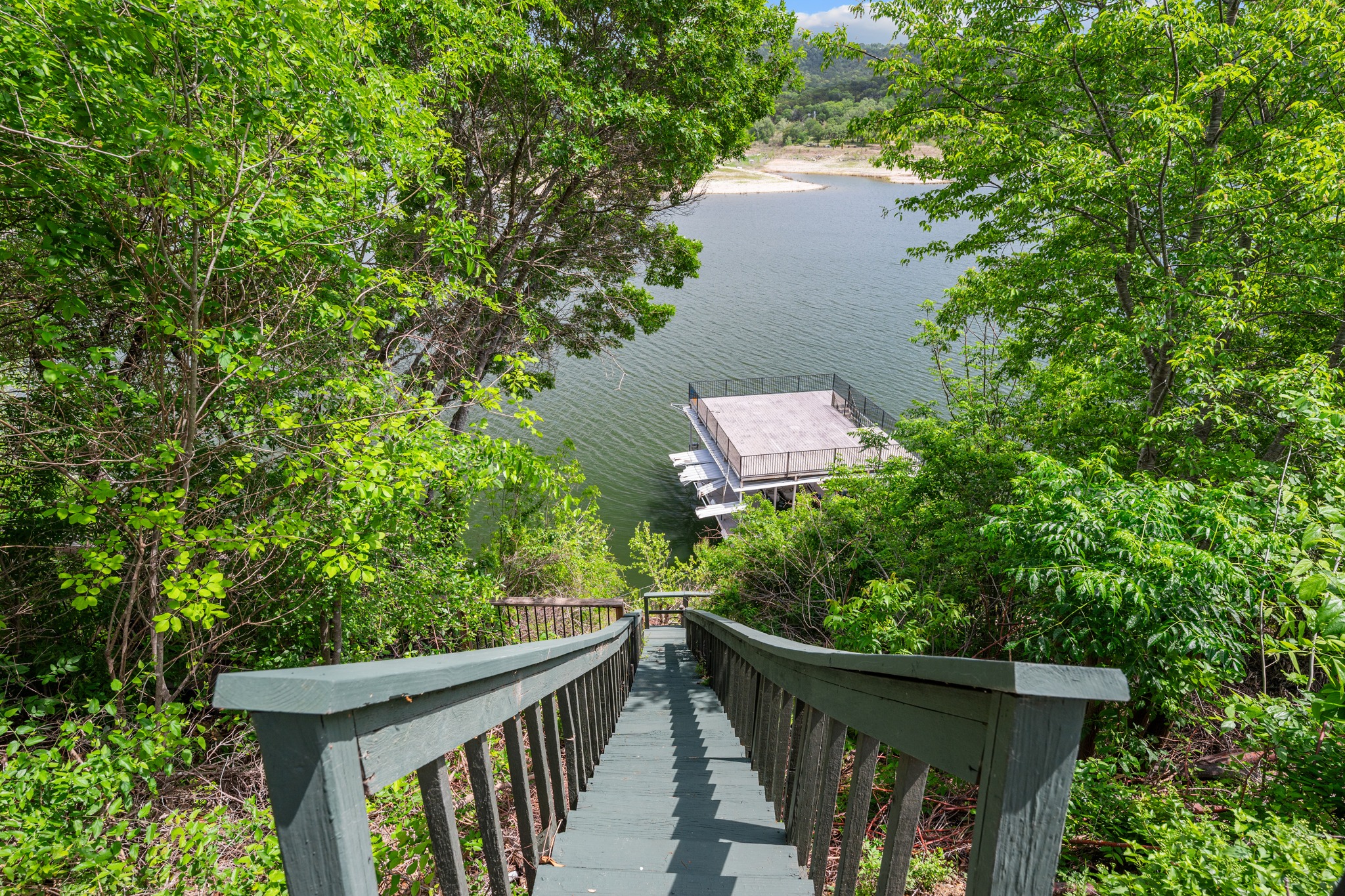 Perched above the Sandy Creek arm of Lake Travis, this fully remodeled waterfront home knows exactly what its best angle is and shows it off well. Set on .76 acres, this one-story 4-bedroom home, or 3-bedroom plus study, was designed to keep the lake front and center. Vaulted beamed ceilings add warmth and character, while the open layout pulls the kitchen, living, and dining spaces together in a way that feels easy, bright, and connected. The kitchen brings plenty to the party too, with an oversized quartz island, stainless appliances, wine fridge, and the kind of setup that works just as well for lazy lake mornings as it does for a full house on the weekend. But the real scene-stealer is out back. A wall of east-facing windows and double French doors open to nearly 2,000 square feet of deck space built for soaking in those wide-open lake views and front-row sunrises. Multiple seating areas, a raised bar, and room to dine, lounge, and gather make this outdoor setup feel like an extension of the home, not just an added bonus. Down below, the backyard keeps going with a fire pit, extra storage, under-deck storage, and steps that lead to the water, where you’ll find a covered one-slip boat dock, jet ski platform, and a second-level sundeck topping 900 square feet over the floating dock. Whether this becomes your full-time home base or your weekend escape hatch, this is the kind of Lake Travis property that makes it very easy to stay awhile. Buyer to verify all info.