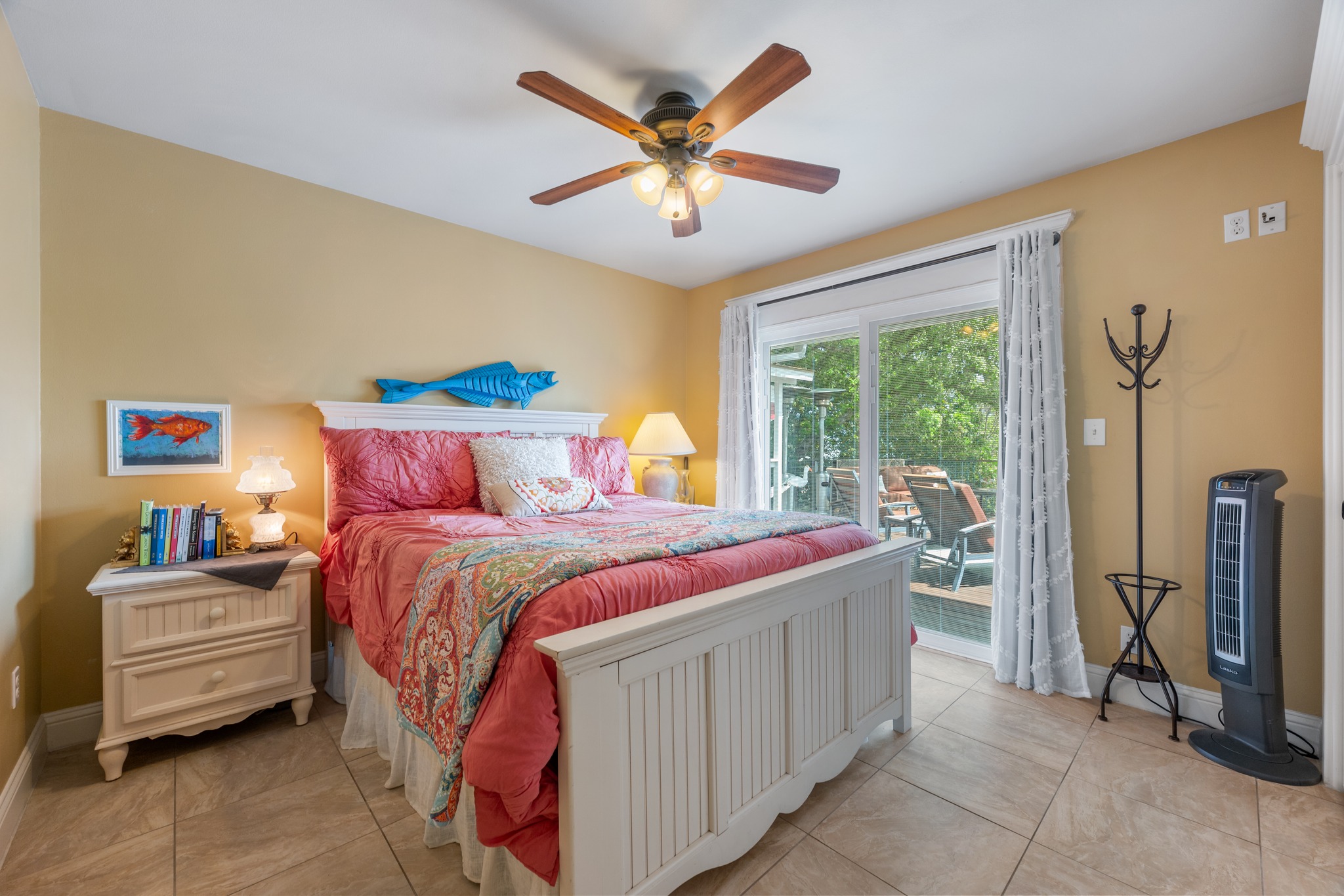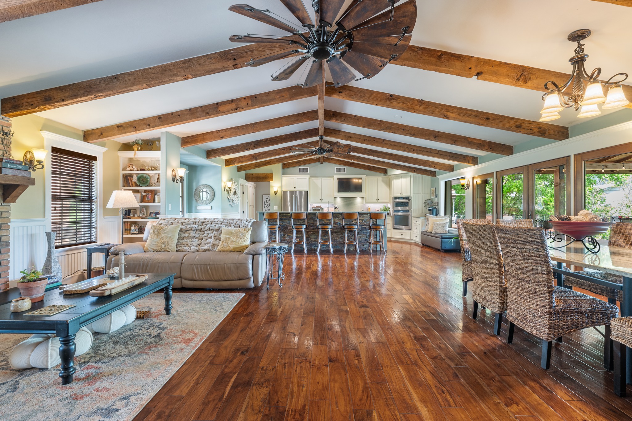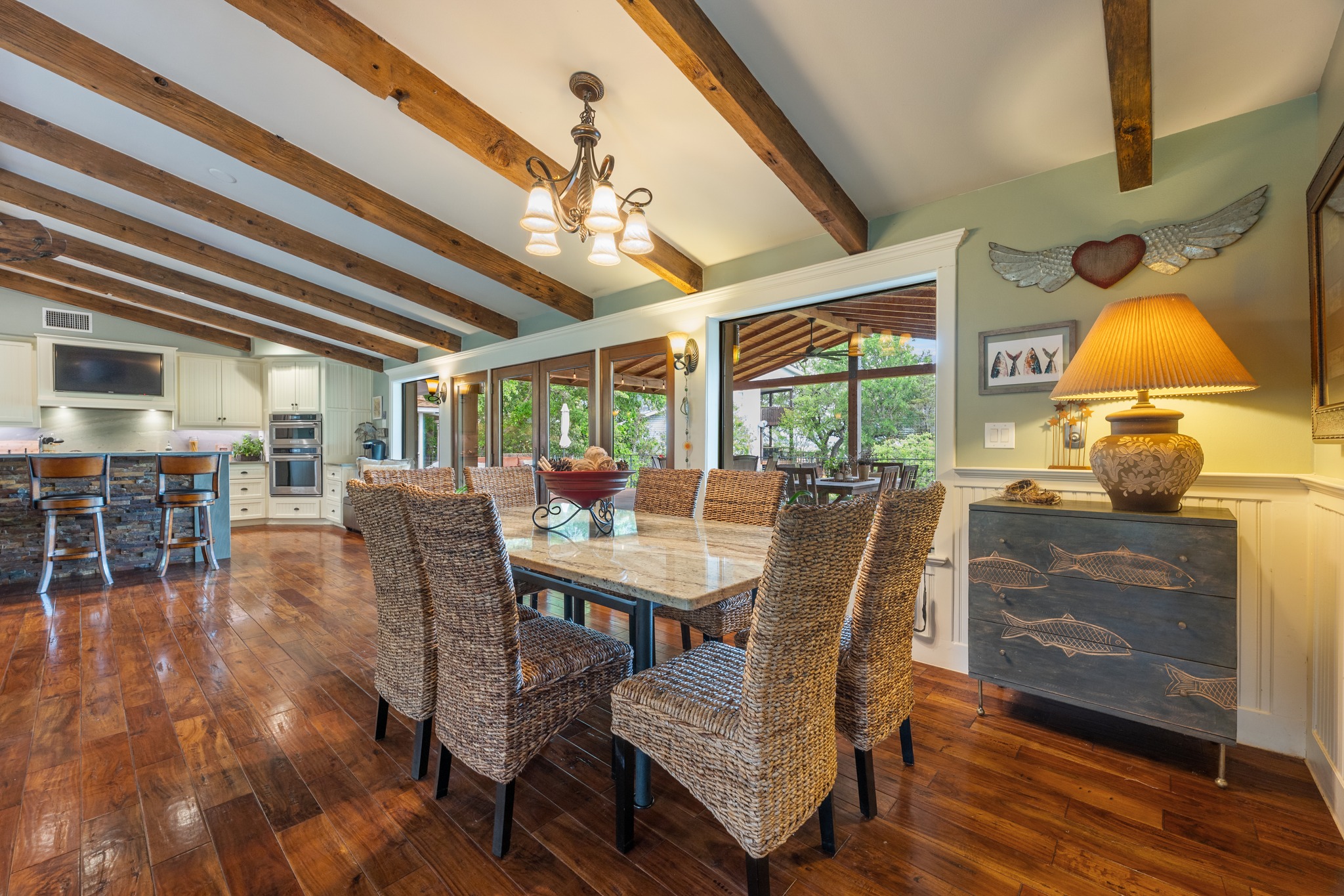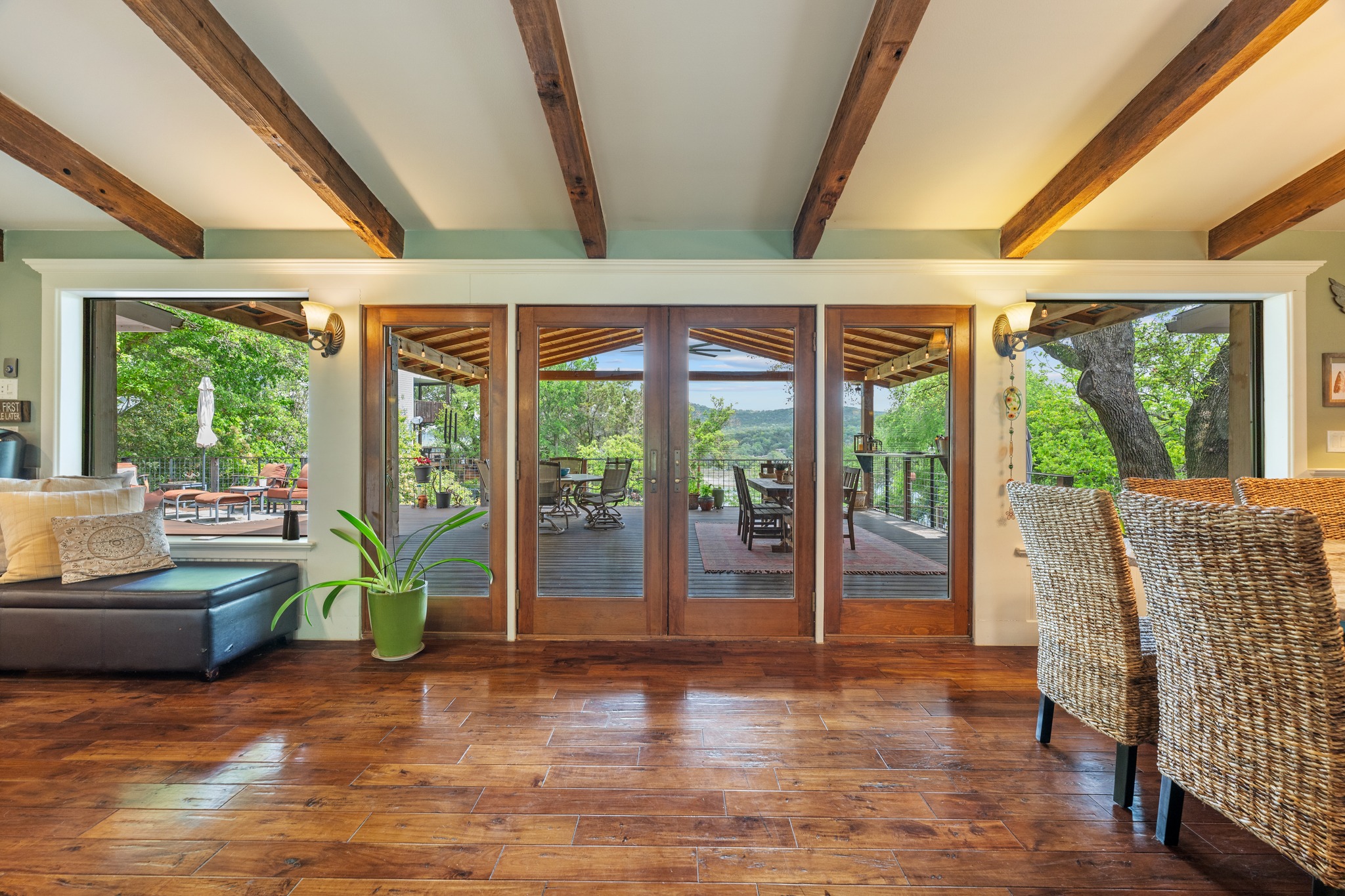 Perched above the Sandy Creek arm of Lake Travis, this fully remodeled waterfront home knows exactly what its best angle is and shows it off well. Set on .76 acres, this one-story 4-bedroom home, or 3-bedroom plus study, was designed to keep the lake front and center. Vaulted beamed ceilings add warmth and character, while the open layout pulls the kitchen, living, and dining spaces together in a way that feels easy, bright, and connected. The kitchen brings plenty to the party too, with an oversized quartz island, stainless appliances, wine fridge, and the kind of setup that works just as well for lazy lake mornings as it does for a full house on the weekend. But the real scene-stealer is out back. A wall of east-facing windows and double French doors open to nearly 2,000 square feet of deck space built for soaking in those wide-open lake views and front-row sunrises. Multiple seating areas, a raised bar, and room to dine, lounge, and gather make this outdoor setup feel like an extension of the home, not just an added bonus. Down below, the backyard keeps going with a fire pit, extra storage, under-deck storage, and steps that lead to the water, where you’ll find a covered one-slip boat dock, jet ski platform, and a second-level sundeck topping 900 square feet over the floating dock. Whether this becomes your full-time home base or your weekend escape hatch, this is the kind of Lake Travis property that makes it very easy to stay awhile. Buyer to verify all info.