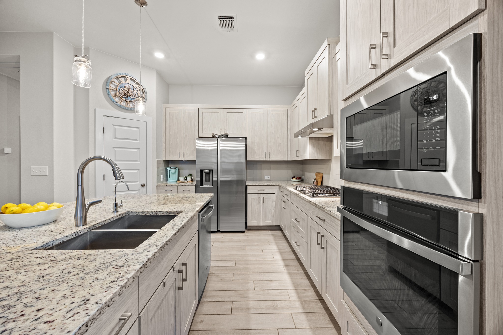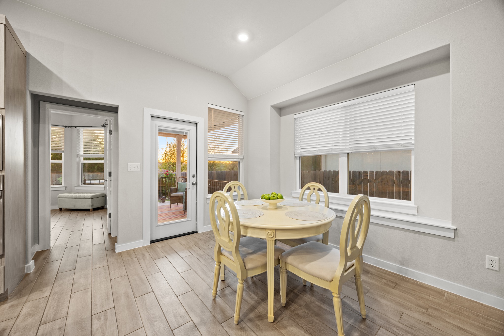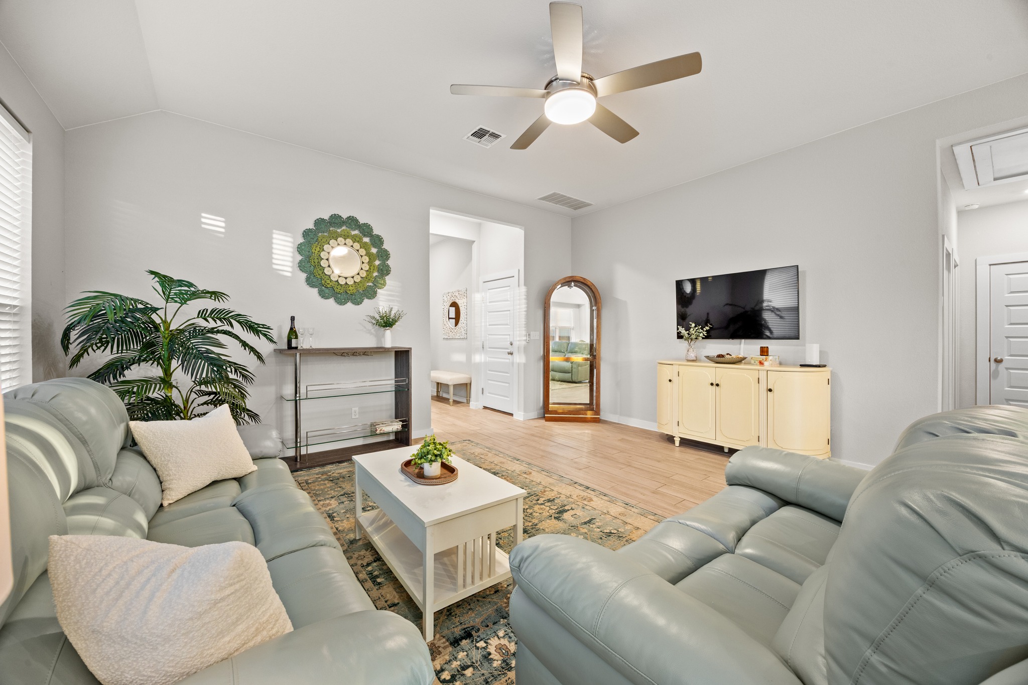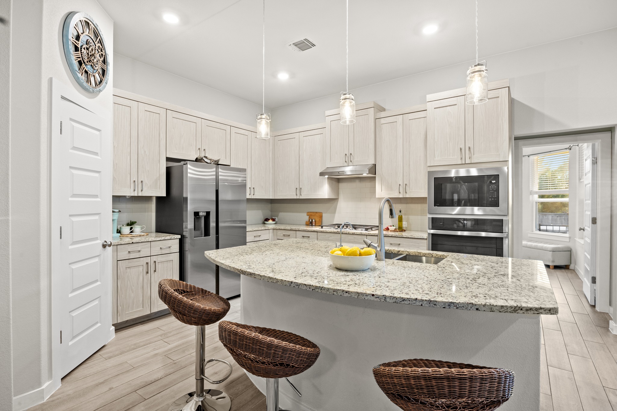 This home has a really inviting presence from the start, with a mix of stone and board-and-batten siding, soft neutral tones, and a front porch that adds just the right amount of charm. Inside, the layout opens up into one connected living, dining, and kitchen space that keeps everything feeling bright, comfortable, and easy to move through. Granite countertops, stainless steel appliances, and a center island anchor the kitchen, and it naturally becomes the spot where everyone gathers, whether it's quick snacks, casual dinners, or catching up at the end of the day. The floor plan is thoughtfully split, with the primary suite tucked on one side for a little extra privacy and two secondary bedrooms on the other. Both secondary rooms offer flexibility for guests or hobbies. A dedicated office at the front of the home adds another layer of versatility, giving you a quiet place to work, create, or simply close the door when needed. Out back, the covered patio wraps along the side of the home, creating a comfortable outdoor space. The home backs directly to the community pond and greenbelt, and a private gate gives you easy access, making walks and fishing part of your routine. Living here also means being part of the Bryson, a community built around connection and time spent outdoors. Trails wind through green spaces, gathering spots encourage neighbors to linger, and events bring people together in a way that feels natural and easy. The Backyard Amenity Center sits at the heart of it all, with a resort-style lagoon pool, river-style splash pad, playscape, galley bar, even-lawn, and more! From live music to movies by the pool, there’s something for everyone. All of it sits just minutes from CapMetro Light Rail and nearby toll roads for easy access to downtown Austin, the tech corridor, dining, and entertainment. A comfortable layout, direct pond access, and a community designed around getting outside make this one feel like more than just a home.